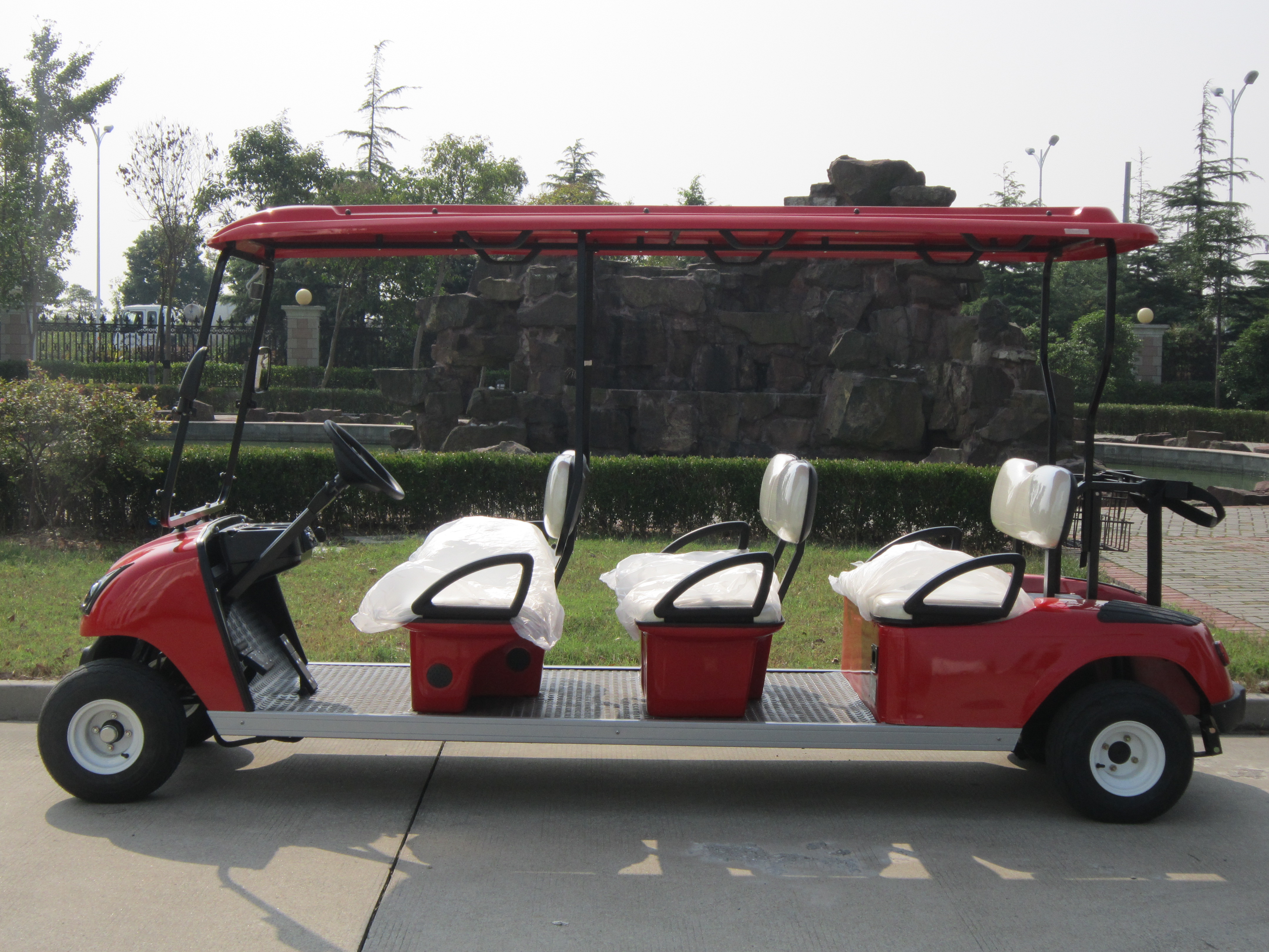 Hochwertiger stylischer Golfwagen. Möbliert für den Transport von 6 Personen. Flüsternd Leise und ein echter Hingucker für Ihren Business Park, Camping, Ferienpark oder Naturpark. Wird standardmäßig mit US-Batterie und Delta-Q-Ladegerät geliefert. Sehr einfach zu bedienen.