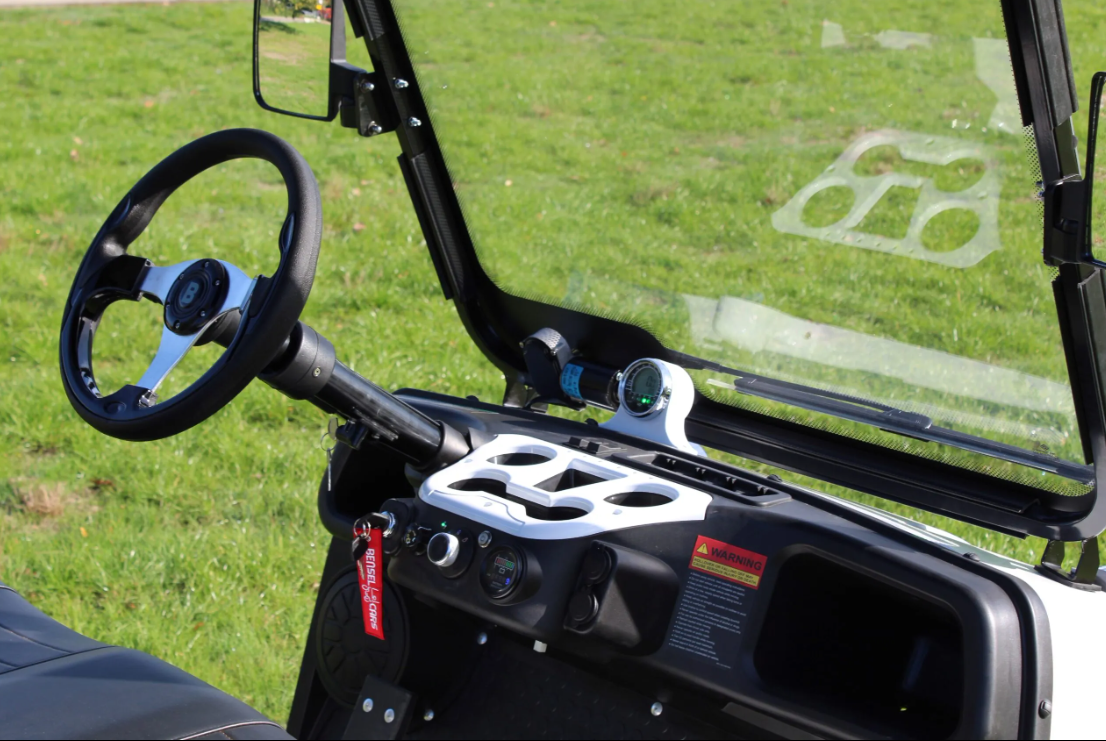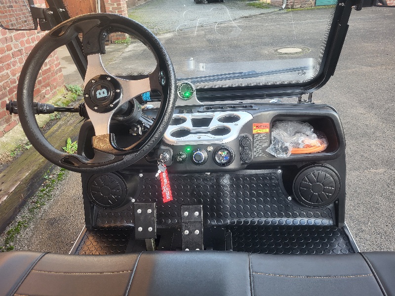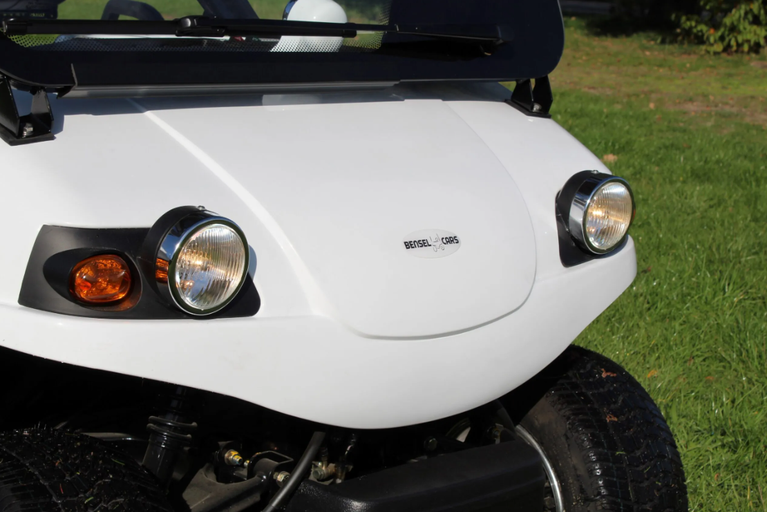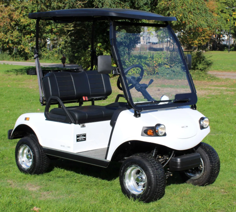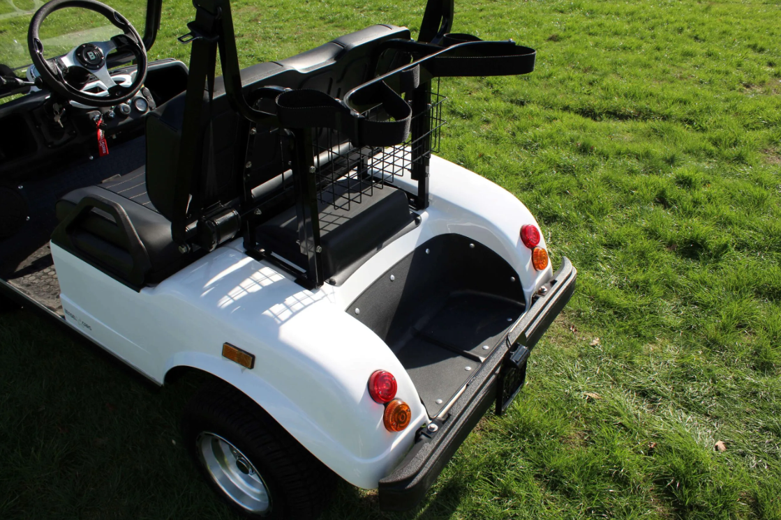 Der BSN2RO ist ein elektrischer Golfwagen mit Nummernschild für zwei Personen. Auf der Rückseite des Golfcarts ist Platz für den Transport von Golftaschen und es gibt auch einen Korb.